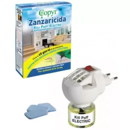 Ricarica insetticida liquido per elettroemanatore Kill Paff Electric prodotto dall Copyr, pronta all’uso e disponibile in confezione singola (flacone da 33 ml). Una volta integrata all’interno del dispositivo, garantisce ben quarantacinque giorni di protezione da zanzare comuni e zanzare tigre.